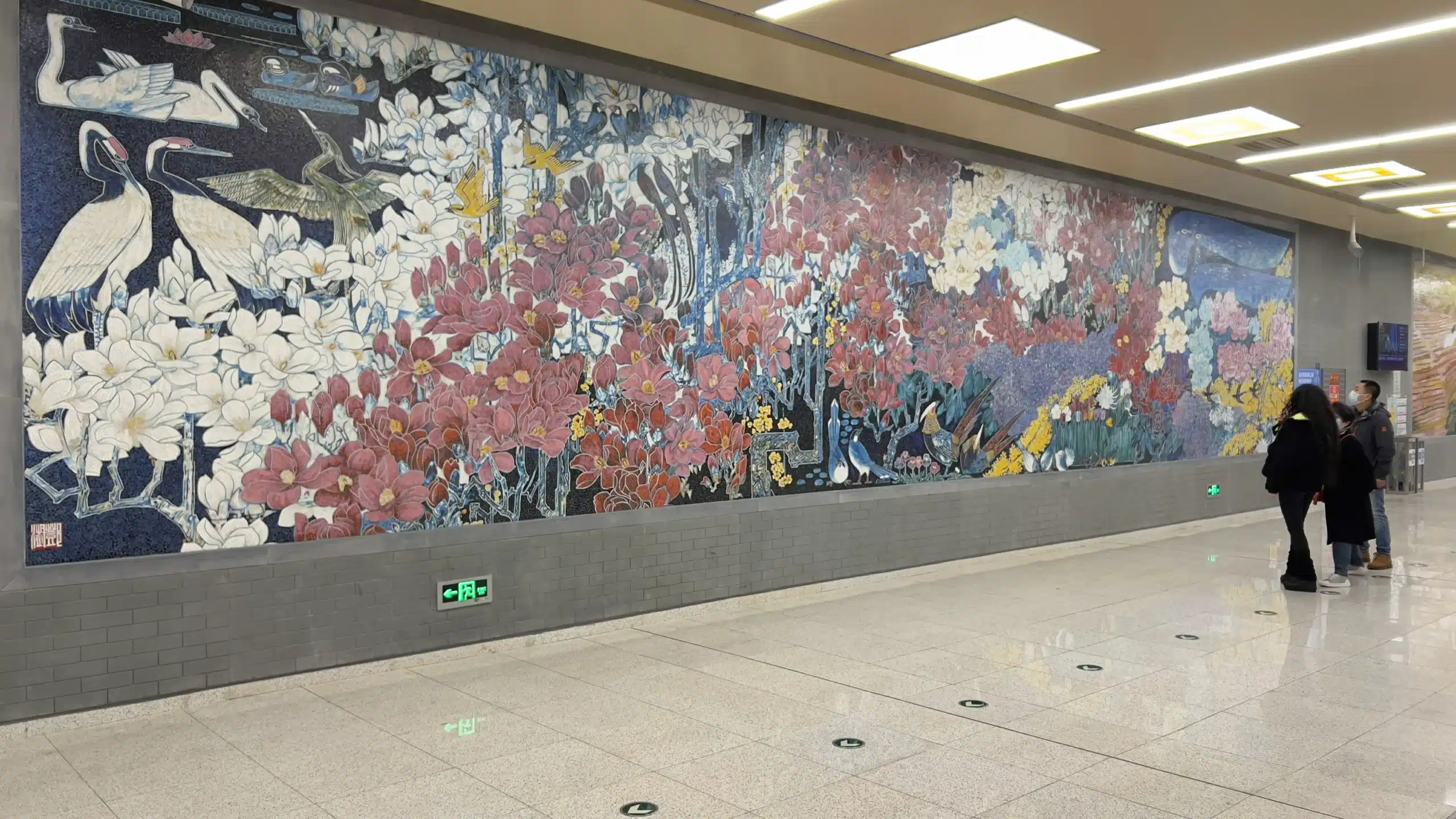 著名美术家侯一民先生曾说:“地铁壁画总体上要展现出北京文化古都的地位,但其中要有轻重缓急。每条线路应该有自己的特点。横贯旧城的线路更注重表现中国传统文化,外围新区则更加现代化。”作为北京文化的重要载体,地铁壁画不仅美化了公共空间,更承载着艺术与文化的传承使命。前门站,作为北京地铁8号线的文化亮点,以《鹤舞长天》《百花齐放》和《红绸舞集》三幅壁画呈现出艺术与工艺的极致融合,为通勤者带来一场视觉盛宴。