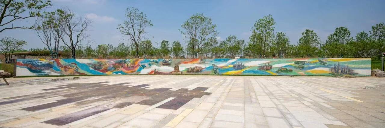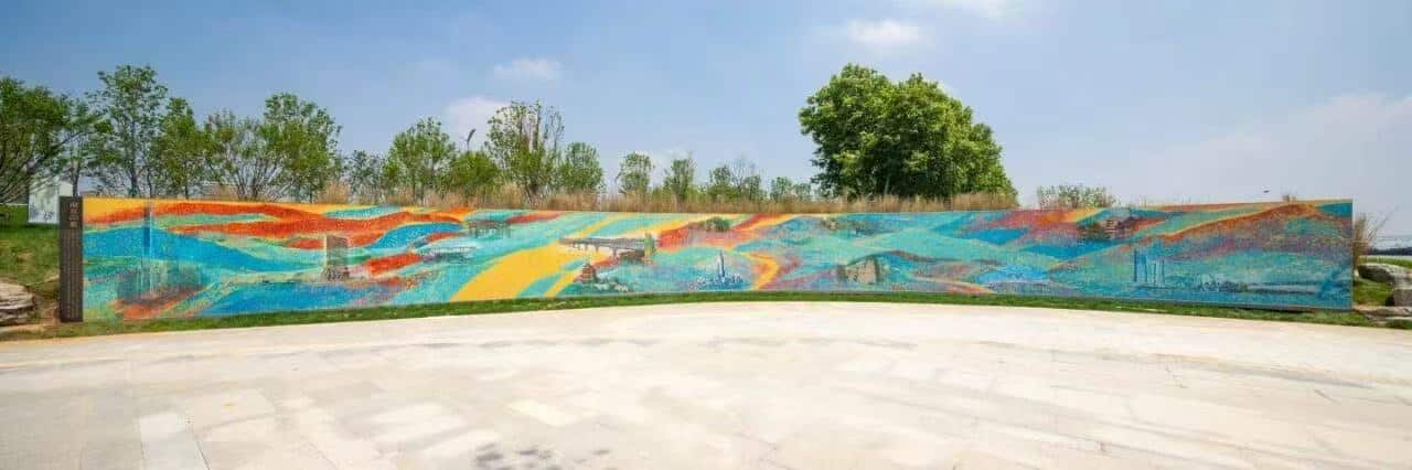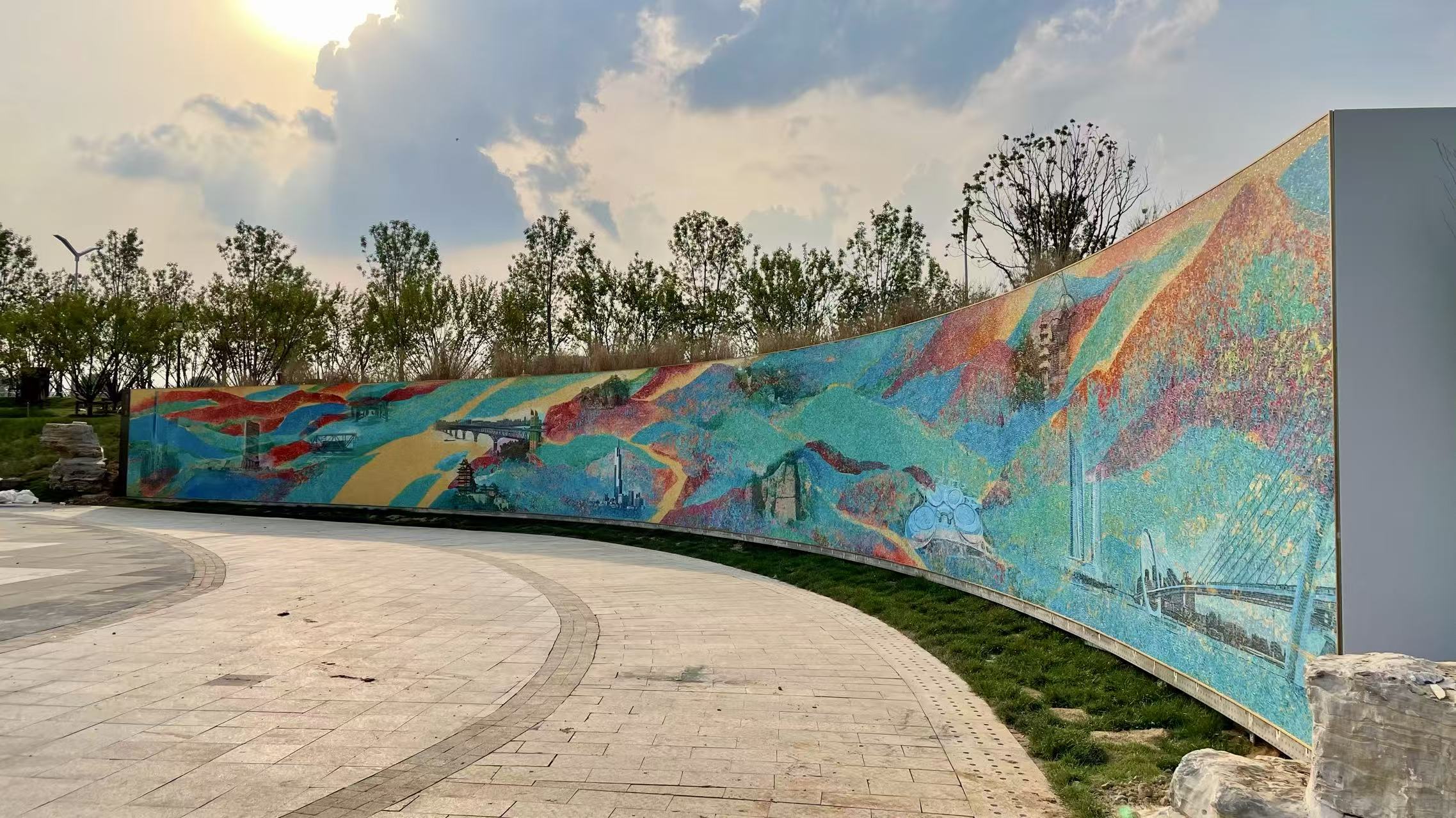 作品以长江为叙事主线,将江水的奔涌节奏转化为层层展开的色彩波动,通过马赛克镶嵌这一具有时间质感的艺术语言,串联起南京的历史记忆、城市地标与人文意象。 画面以流动的“江势”为骨架,融合城墙、塔楼、桥梁等南京城市符号,在抽象与具象之间建立平衡,使整幅壁画如同一条在地展开的“视觉长江”,既回应真实的江岸空间,也承载着城市发展的时间脉络。色彩由冷暖交错铺陈,象征江水、土地与城市能量的交汇,使行走其前的观者在移动中感受连续而开放的城市叙事。