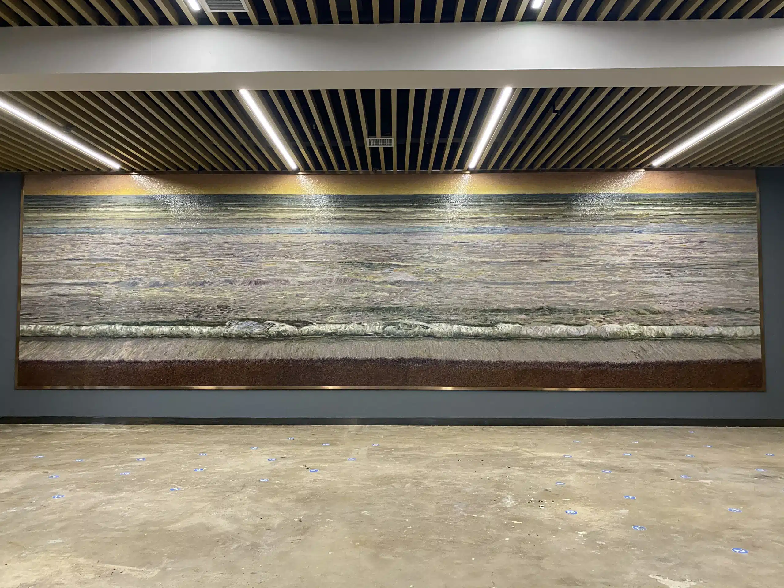 作品以横向延展的构图呈现出水平面的静谧景象。艺术家通过玻璃材质的通透与层叠特性,将海面、浪涌与光影变化细致地融入画面之中,使作品在不同观看距离与灯光条件下呈现出微妙而持续变化的视觉效果。 画面摒弃具象叙事,以克制而细腻的肌理表达自然的时间性与流动感,既回应了学术报告厅理性、开放的空间属性,也为公共空间引入一处可沉静观看的精神场域。玻璃所承载的光感与反射,使作品在环境中成为“被激活的画面”,在行走与停留之间,持续生成新的观看体验。