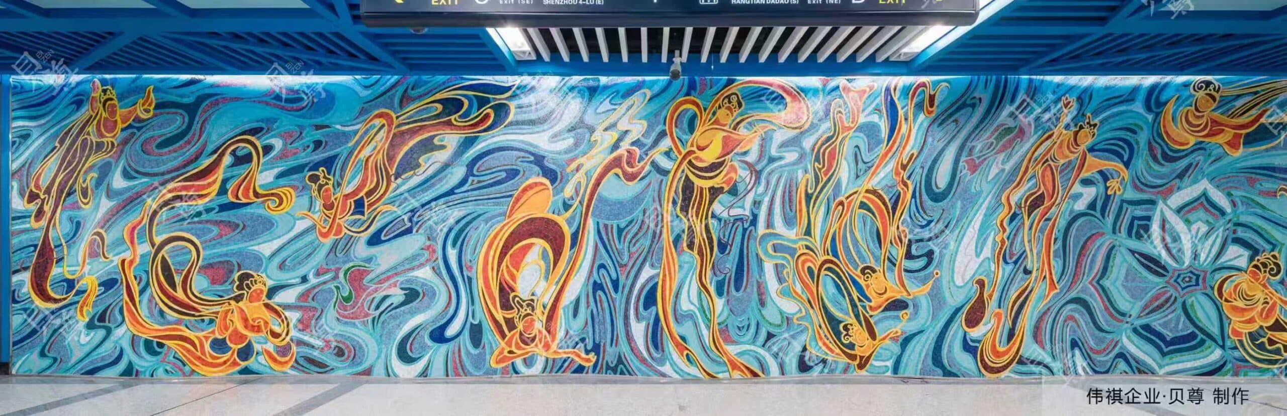 作品画面以中国古代的飞天为创作元素 将敦煌壁画中飞天形象进行抽象化艺术加工 千姿百态的飞天凌空翱翔在奇幻无穷的宇宙空间 整体色调鲜明亮丽 寓意人们在锲而不舍地追梦太空,颜色夺目,线条优美是这幅作品带给观者的第一享受。在制作前,我们尝试了多种不同的材料搭配和表现方式。为了突出飞天人物主体,最终选用艺术大块料作为此部分的表现方式,而背景则选用小料马赛克来搭配。以大块料的厚度、大小与小料马赛克形成质感和主次关系的对比,使画面层次更加分明,具有观赏性。