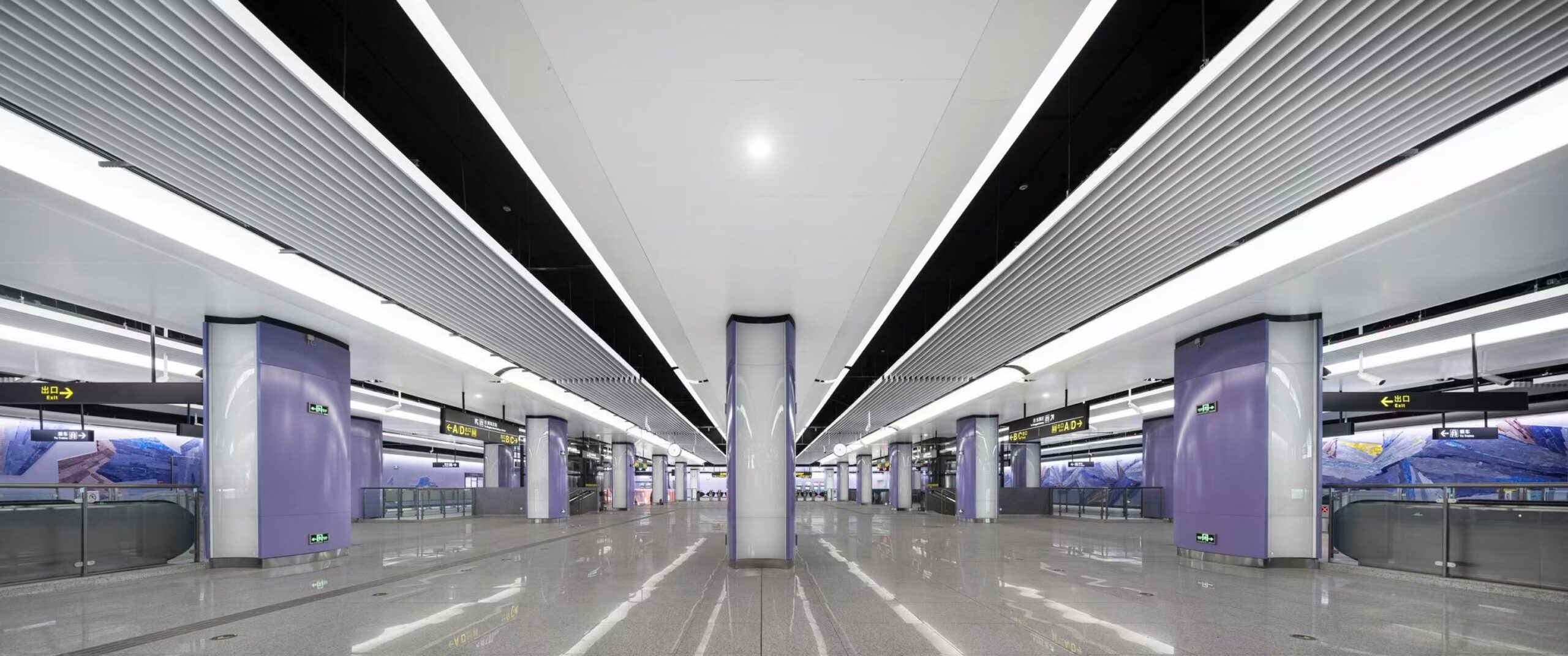 《紫岚》以紫兰色为主要色调,玻璃块料分块铺开,再用紫灰、蓝灰等块料逐层加上,丰富画面。浪漫的紫色带给乘客沉浸式的空间体验,踱步于站厅空间中,似被紫兰花海簇拥,漫天散落的花瓣被定格在空中。